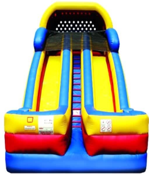 Get ready to elevate your event with our spectacular 20' Dual Lane Slide with Side Exits! Perfect for large gatherings and events where maximizing fun is a top priority, this giant slide is designed to keep the excitement levels at an all-time high. This dual lane dry slide features a thrilling 60-degree slope that promises an exhilarating ride for all participants. With a center entrance and side exits on both lanes, the slide ensures smooth and efficient flow, allowing more guests to enjoy the excitement simultaneously.
