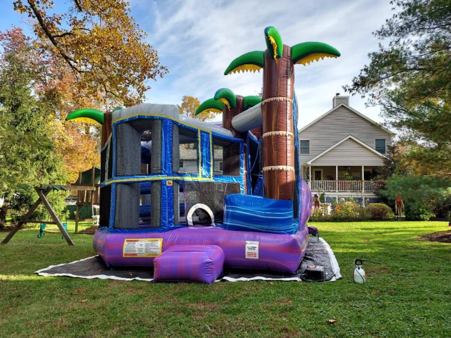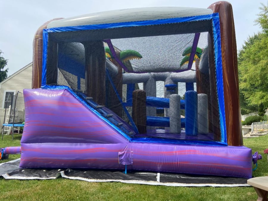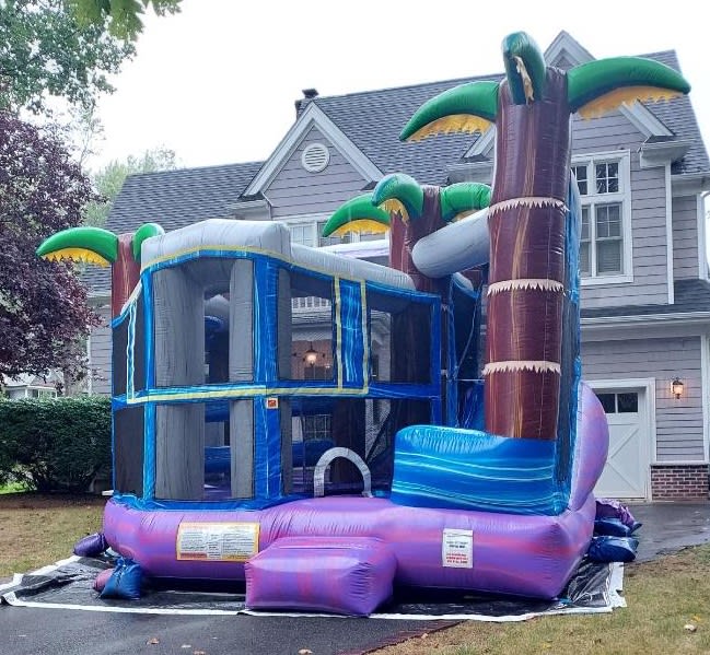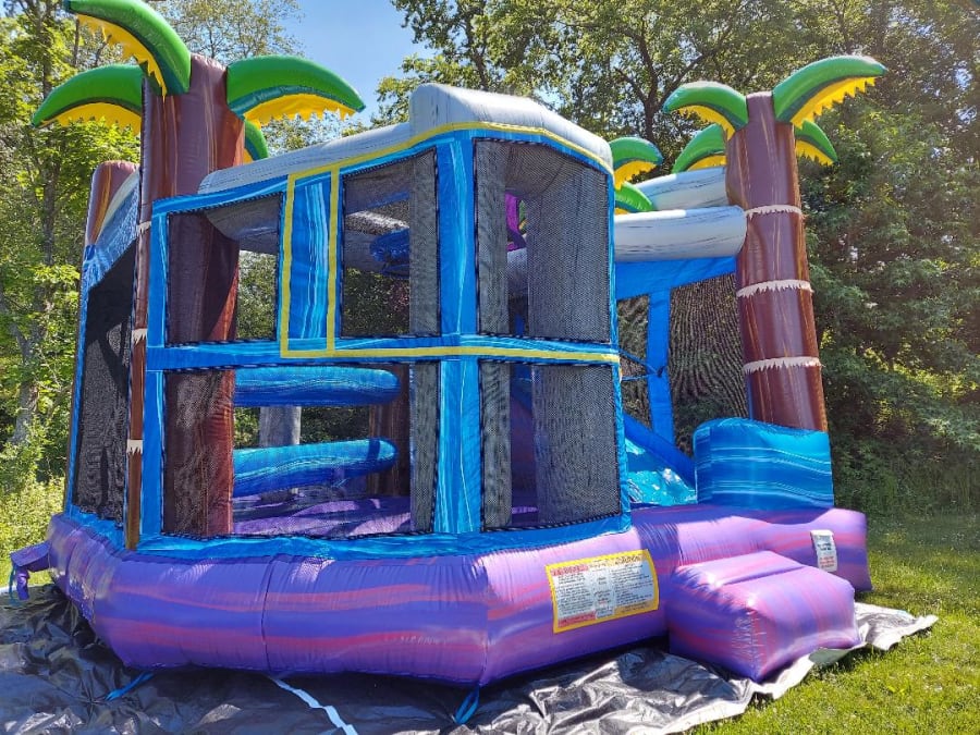 Get ready for the ultimate inflatable adventure with the Wet Tropical 5-in-1 Combo! 🌴 This bounce house is more than just a jumper – it's a complete entertainment package for your next event. 🎉