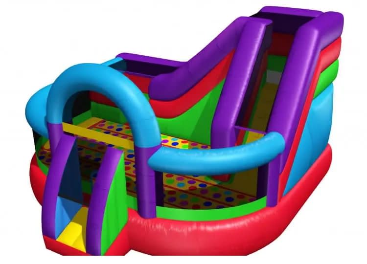 With its vibrant colors the Wet Twisting Combo stands out as a top choice for entertainment rental. It is perfect for backyard fun! Watch as the children play Twister, dunk a basketball (balls not included) slide down the water slide or bounce for hours.