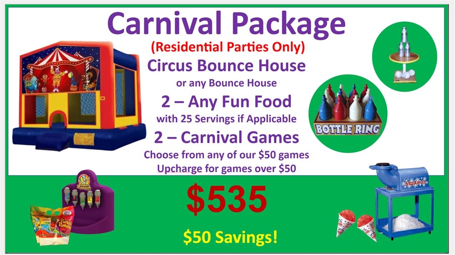 The circus is in town. Choose from any $295 bounce house, (1) fun food machine, (1) craft and (2) carnival games (choose from the $50 games or pay the upcharge)